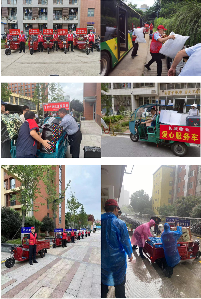 为解决宿舍楼与停车点之间行李运输困难的问题,保卫与校园管理处组织我校4家物业服务企业组建志愿服务车队,共提供电动三轮车27辆、小推车28辆,冒着酷暑运送行李2400余趟,4家物业服务企业一共组织了志愿者655人次。