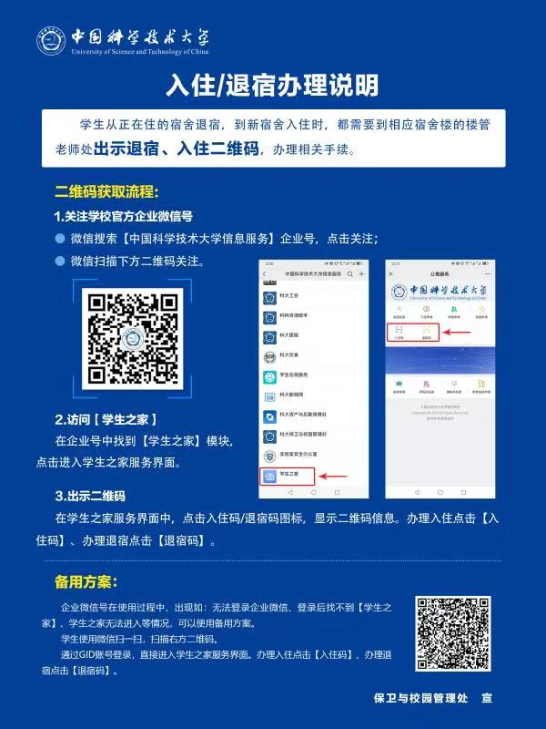 信息赋能,提升效率。今年暑期搬迁期间,学生社区服务中心启用了新的宿舍管理系统,学生只需通过手机登陆学校微信公众号学生之家,出示相应二维码,即可高效完成入住及退宿手续,线上系统简化了业务流程,缓解了批量入住时的排队等待现象,有效提高了宿舍管理及服务的效率。